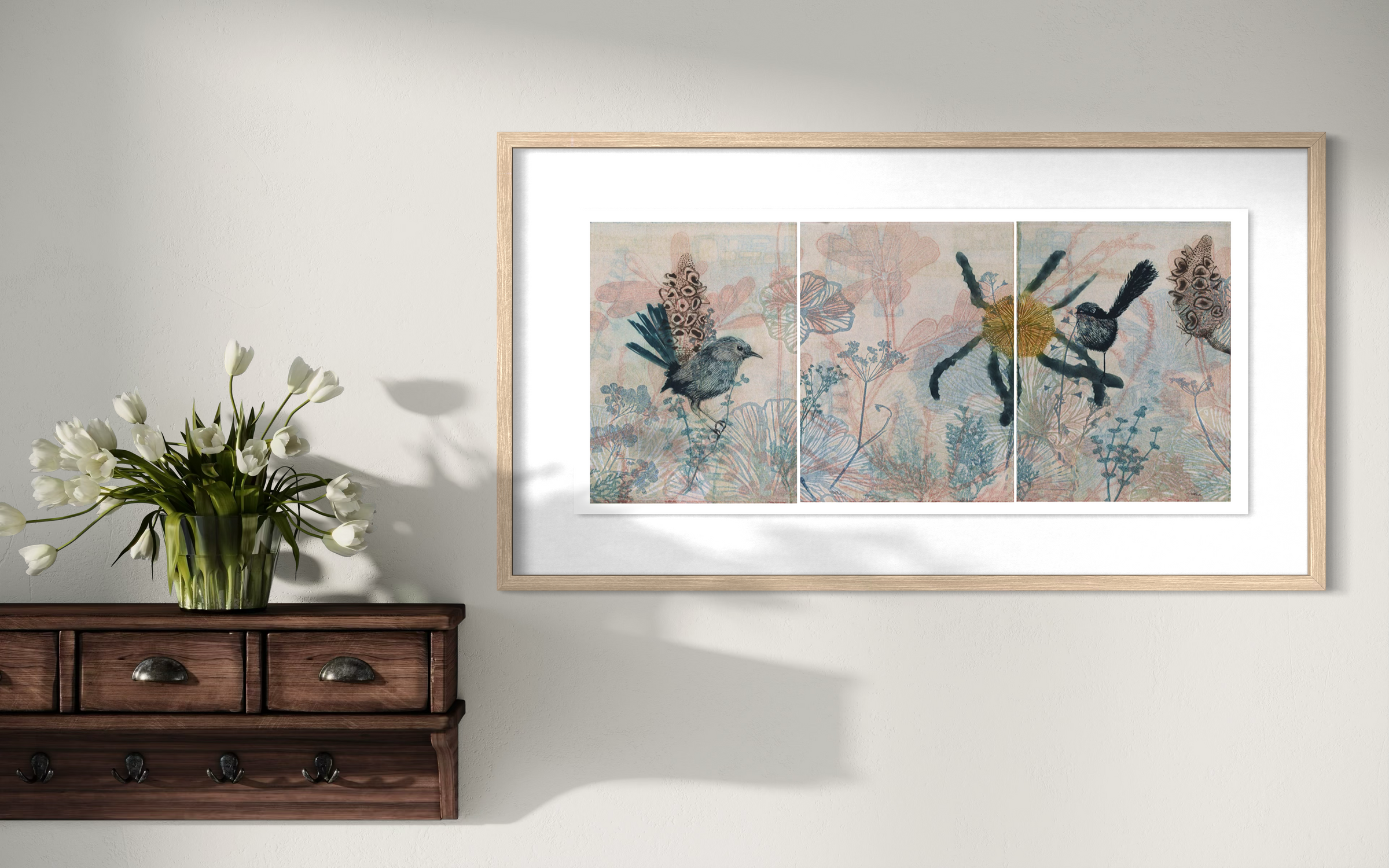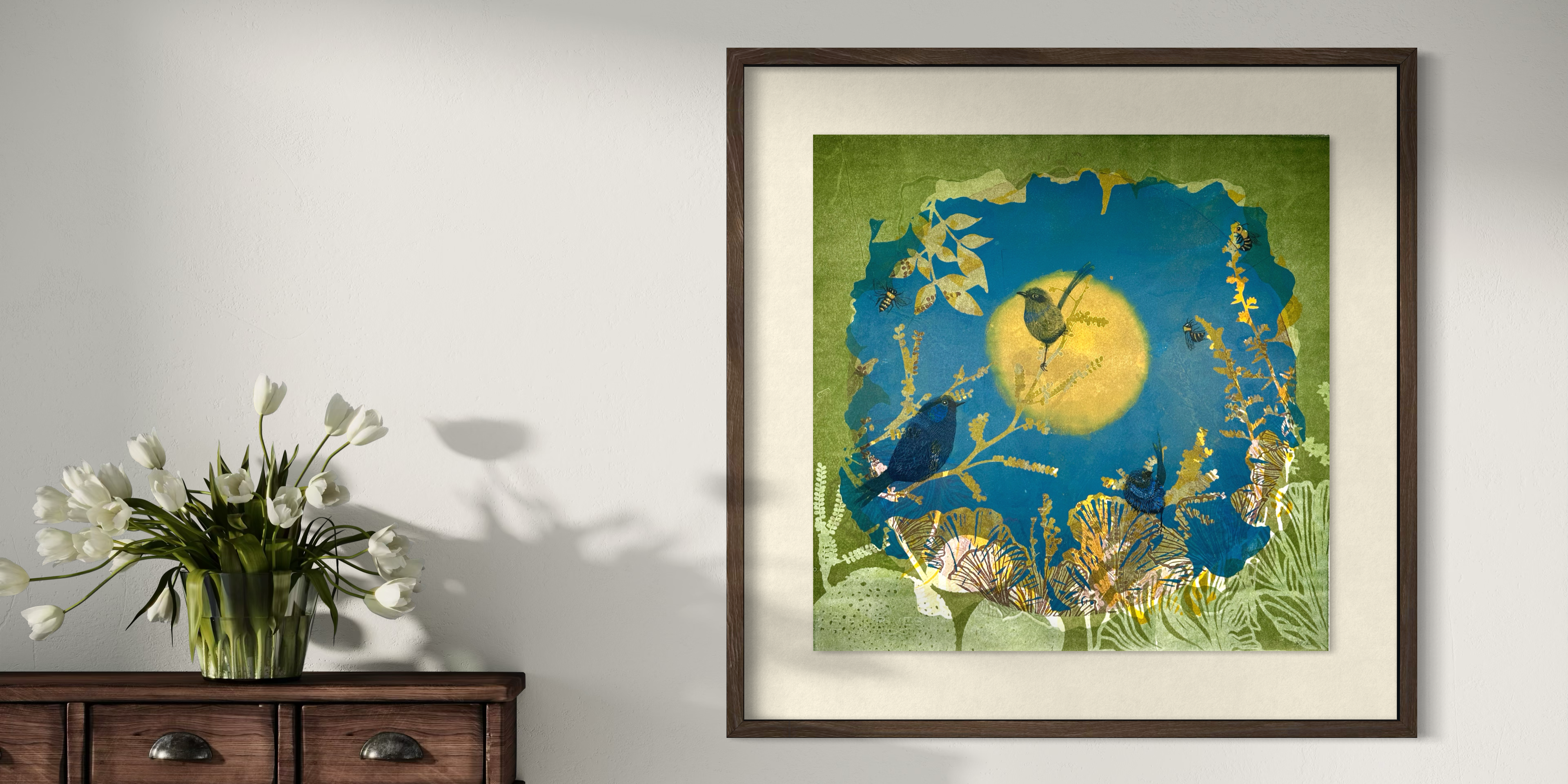 Working with solar plate etching, monotype, and layered print processes, her work explores place, memory, and the quiet rhythms of flora and fauna. Trudy’s art is collected internationally and exhibited with leading Australian galleries, offering collectors thoughtful, one-of-a-kind works grounded in process, observation, and care.