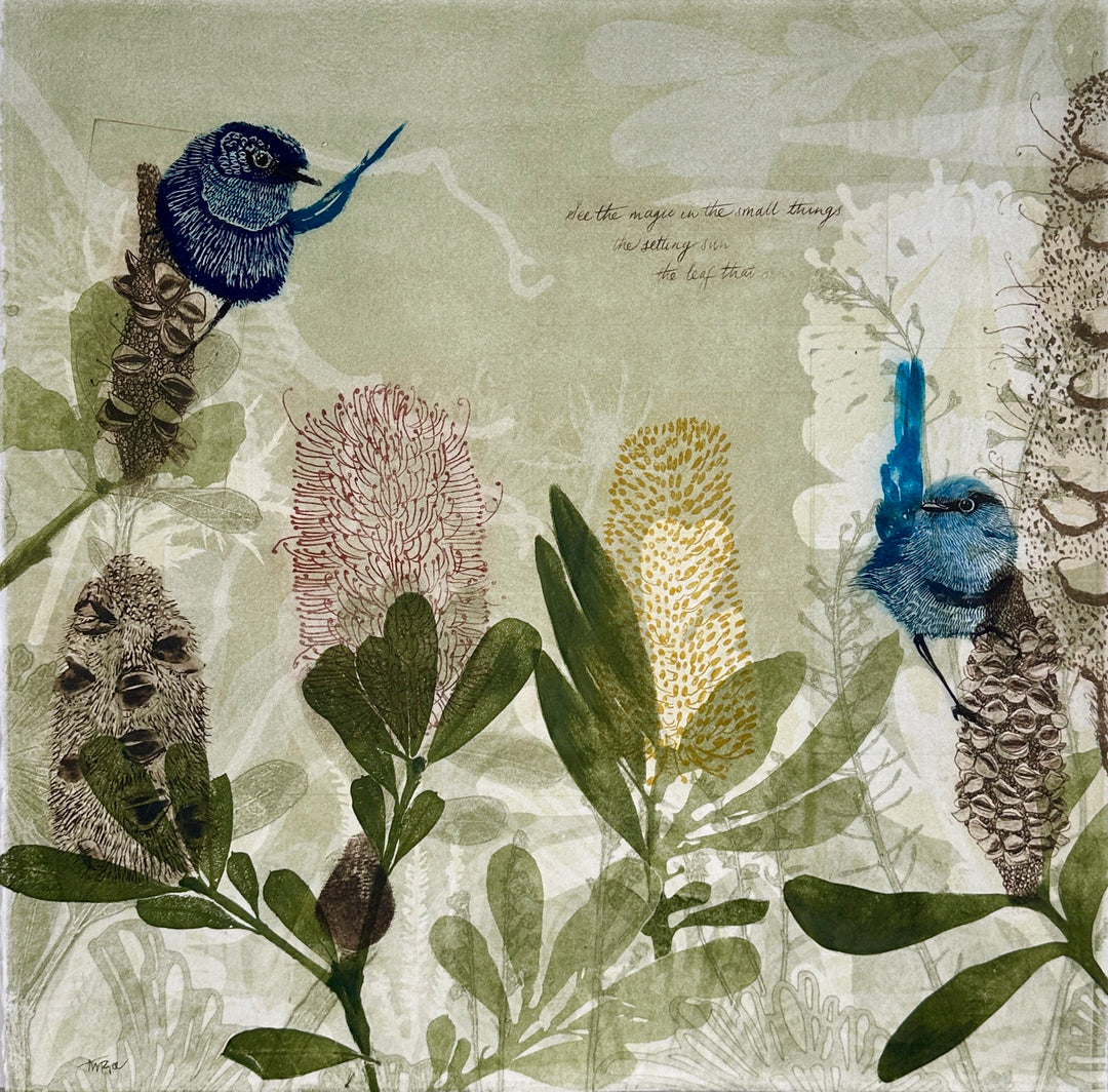 I have had eczema since I was a baby and the toxicity of the acid and some solvents played havoc with my skin. So I researched all the non-toxic printmaking methods and happened upon the talented solar plate etcher Janet Ayliffe who just happened to be running a workshop at Warringah Studios in Sydney. I was captivated by this marvellous technique, and it was a fascinating and significant turning point in my art practice. I didn't touch solar plate etching for the following two years but was again enticed to do a refresher course with Janet and fell in love with the process all over again. I set up my studio to work in this beautiful, magical medium, convinced that I would work this way for many years.
