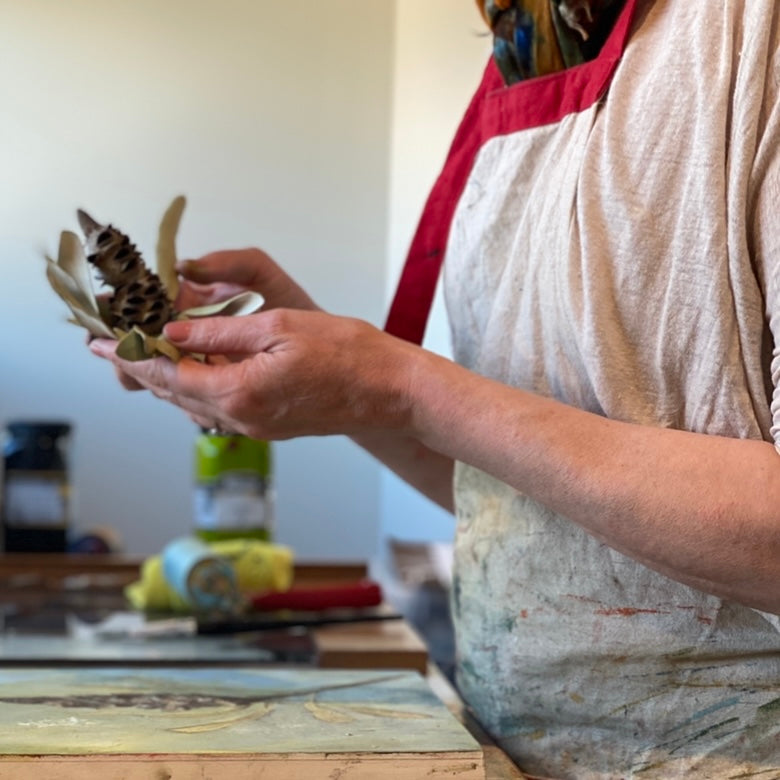 My studio is filled with specimens collected from the bush and sea. Clear air, gorgeous skies, beach and bush all provide a never-ending palette to draw from. One of my favourite specimens is the Banksia, a stunning Australian native flower with many different varieties, colours and textures.