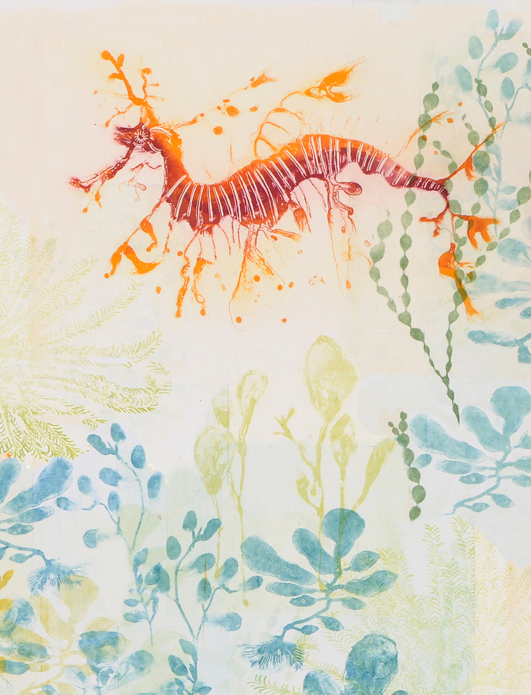 A few years back I was strolling on the beach with my father-in-law and we found a perfectly preserved weedy sea dragon. I took it home, photographed it, but didn't have time to draw it that day. The following day I went to make a sketch and found the sea dragon was missing. Searching around the house, I sadly found its head in my dog's bed. He had eaten it like a chew bar. Needless to say, I cried! A find like this is so incredibly rare. As It turned out, our neighbors had found a similar specimen at the same time. We believe a storm had washed them up onto the shore. They were kind enough to allow me a few hours at their home to draw and capture a fair likeness...a better ending to my sad story!
